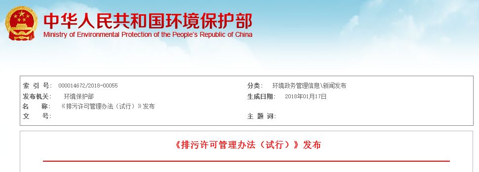 《排污许可管理办法(试行)》已于2017年11月6日由环境保护部部务会议审议通过,现予公布,自公布之日起施行。