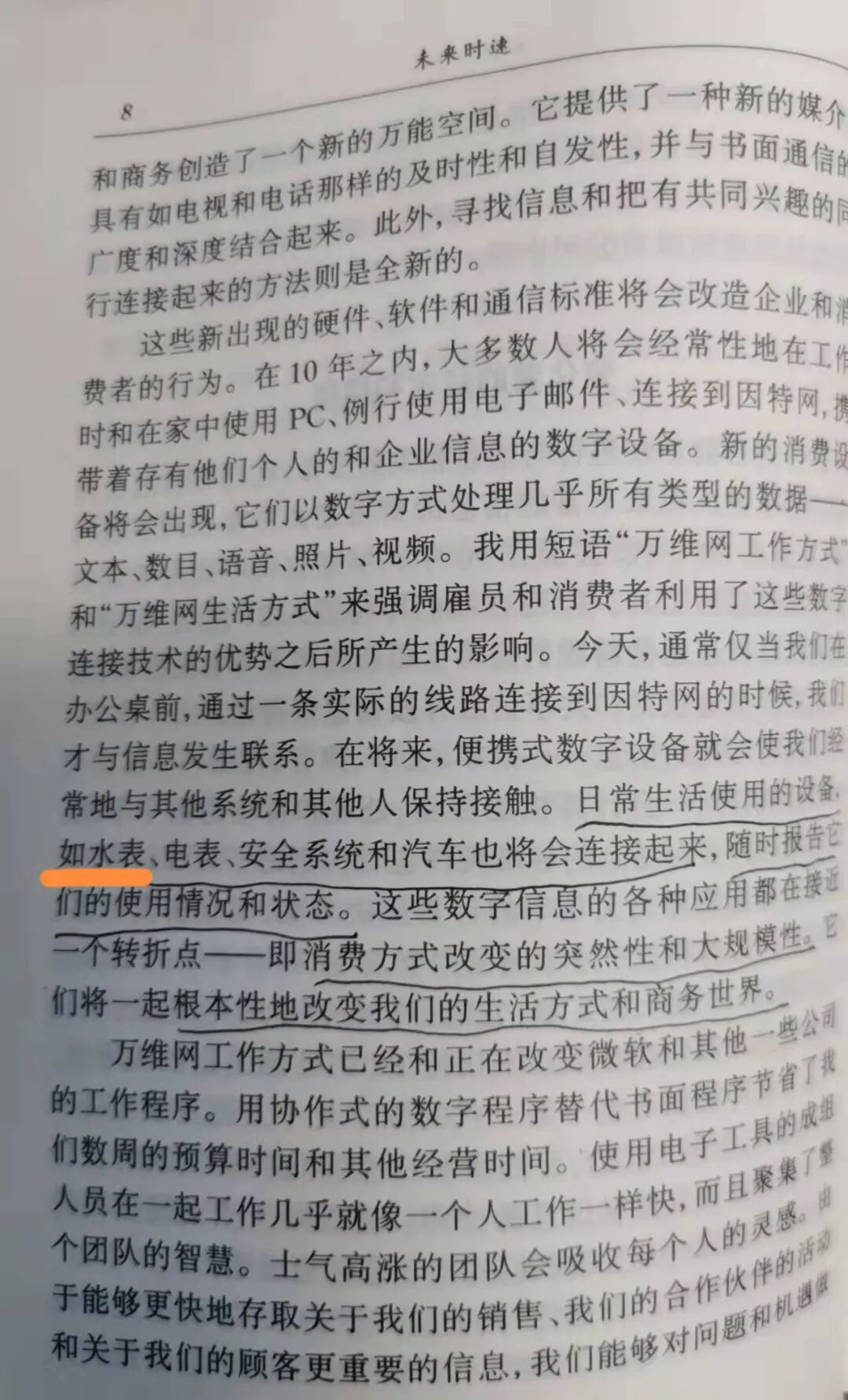 比尔盖茨在1999年写了一本书《未来时速——数字神经系统与商务新思维》提到了水表: