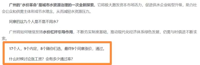 首先,看了相关新闻与报道,又是一种“如鲠在喉,不吐不快”的强烈感受,所以我不得不先从“舆论战”开始讲。舆论场上,“低级红”“高级黑”现象一旦发生,就会被人聚焦关注、放大炒作。在水价调整事件中,低级红、高级黑现象层出不穷。从广州水价调整方案这则案例中,又是一个非常鲜明的体现。我不得不重炒多年前的“冷饭”,以求温故而知新,还是应了那几句老话:“水务行业无新鲜事”、“历史不会重复,但总是押韵的”。